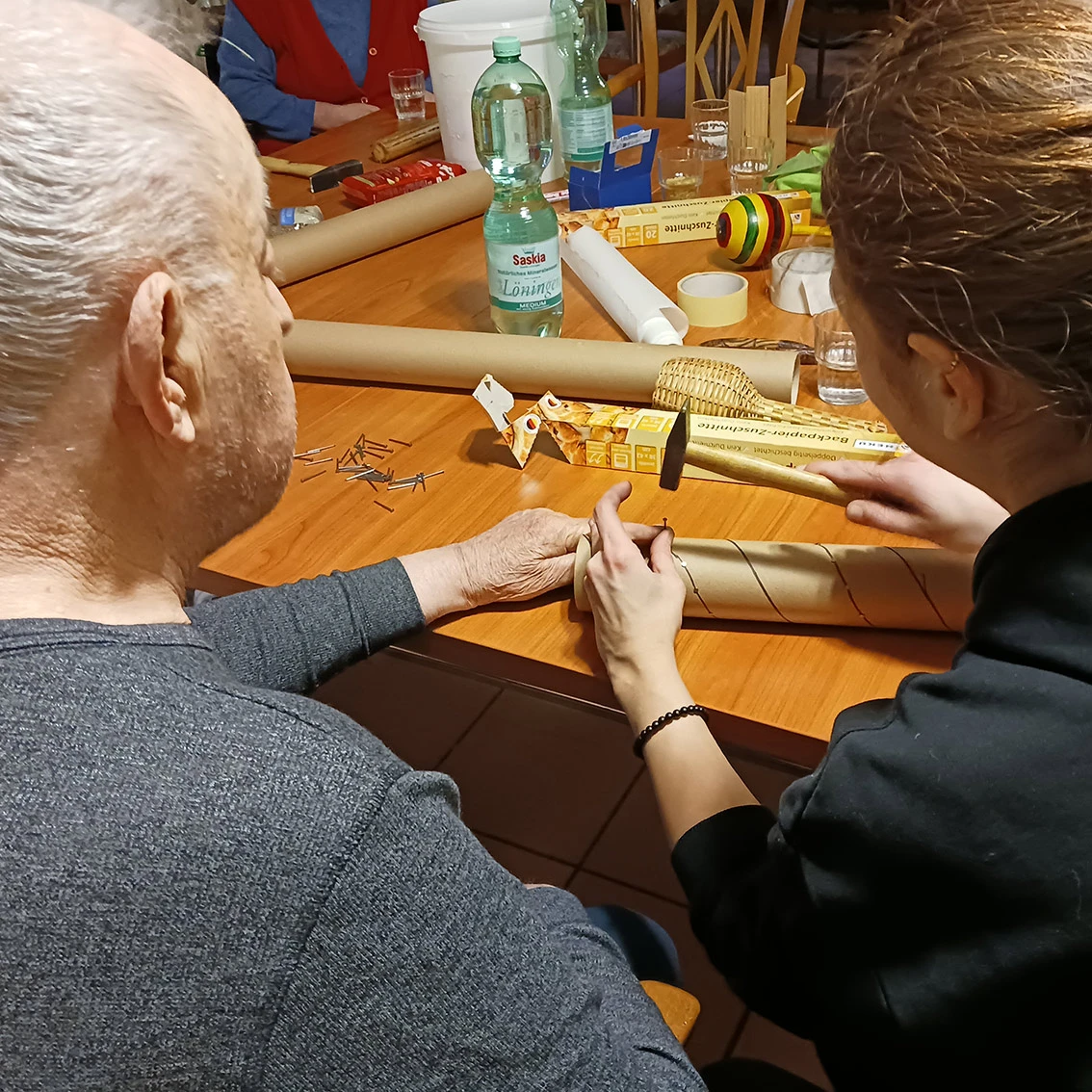Jul 2024 - Das dachten sich auch einige Bewohnerinnen und Bewohner des Glockengartens, als neulich bei uns „Die Werkzeugkiste“ bei uns zu Besuch war. Im Rahmen des Projekts Atelier_Vital konnten wir Tobias Marquardt mit seiner mobilen Werkbank insgesamt dreimal bei uns im Haus willkommen heißen. Dabei wurden unterschiedliche Objekte aus Holz gefertigt. Die Teilnehmenden waren dabei auf voller Linie gefragt. Es wurde ausgemessen, angezeichnet, selbst gesägt, geleimt und geschliffen. Für den einen eine altbekannte Tätigkeit, bei der schöne Erinnerungen an früher aufkamen. Für manch einen aber auch eine völlig neue Erfahrung, die den Horizont noch einmal erweiterte.