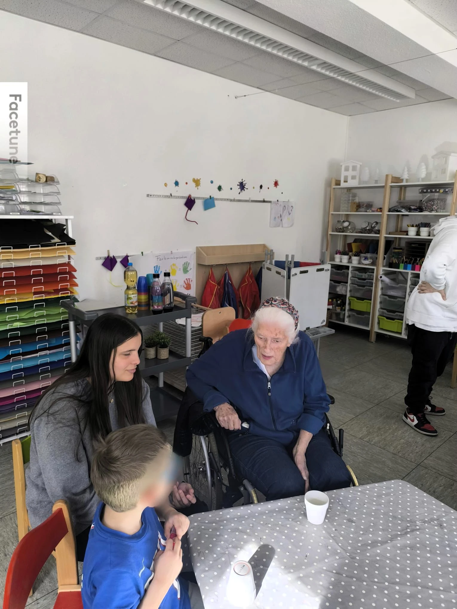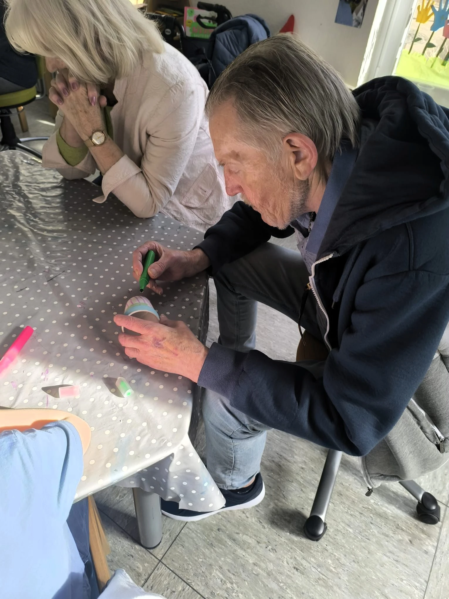 Neben dem kreativen Arbeiten stand vor allem das Miteinander im Vordergrund. Schnell entwickelten sich Gespräche zwischen Jung und Alt: Kindser und Bewohner sprachen gemeinsam über Farben, Muster und Ideen und unterstützten sich gegenseitig. Die Kinder waren mit großer Begeisterung dabei, und auch unsere Bewohnerinnen und Bewohner genossen die lebendige Atmosphäre sichtlich.