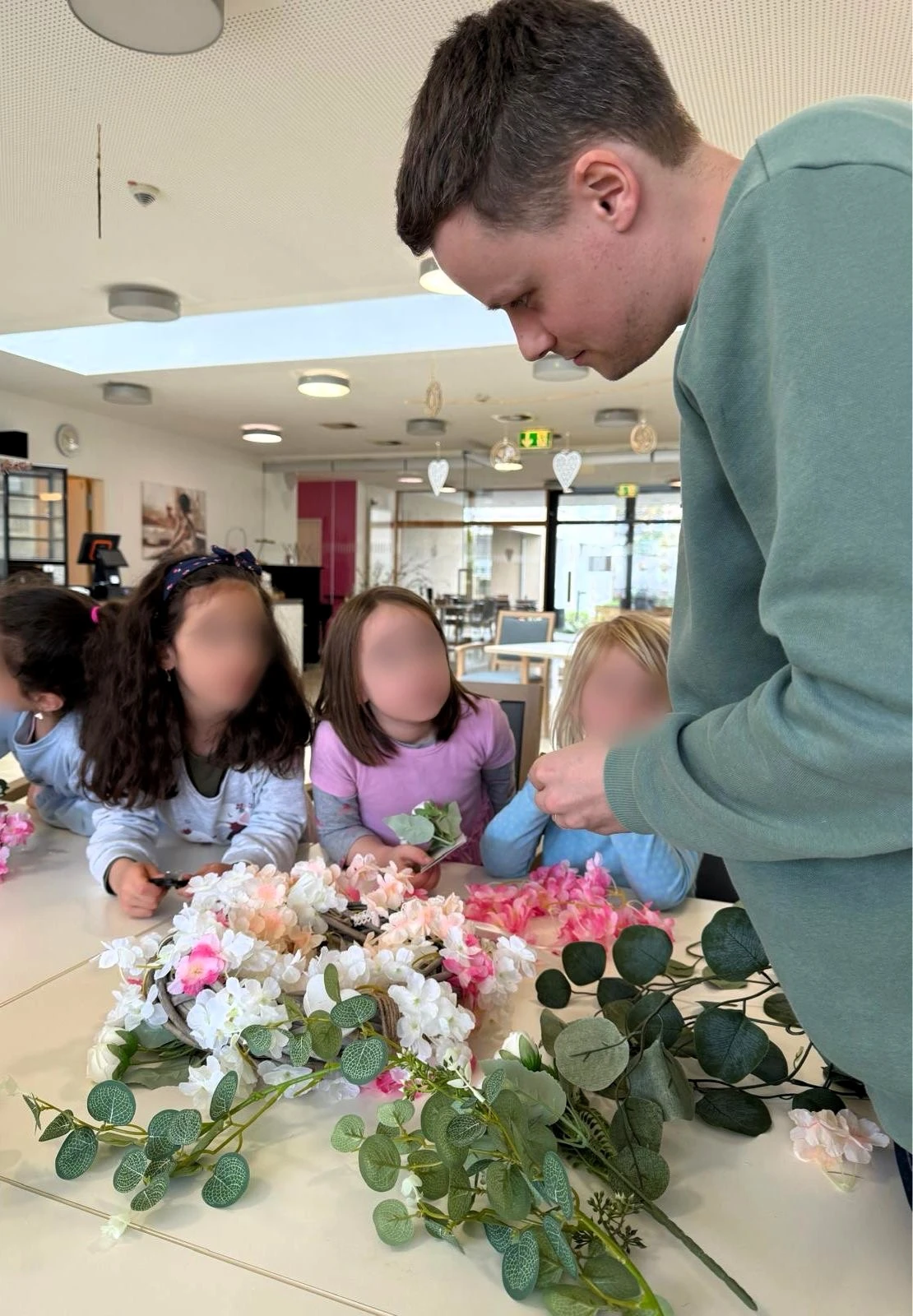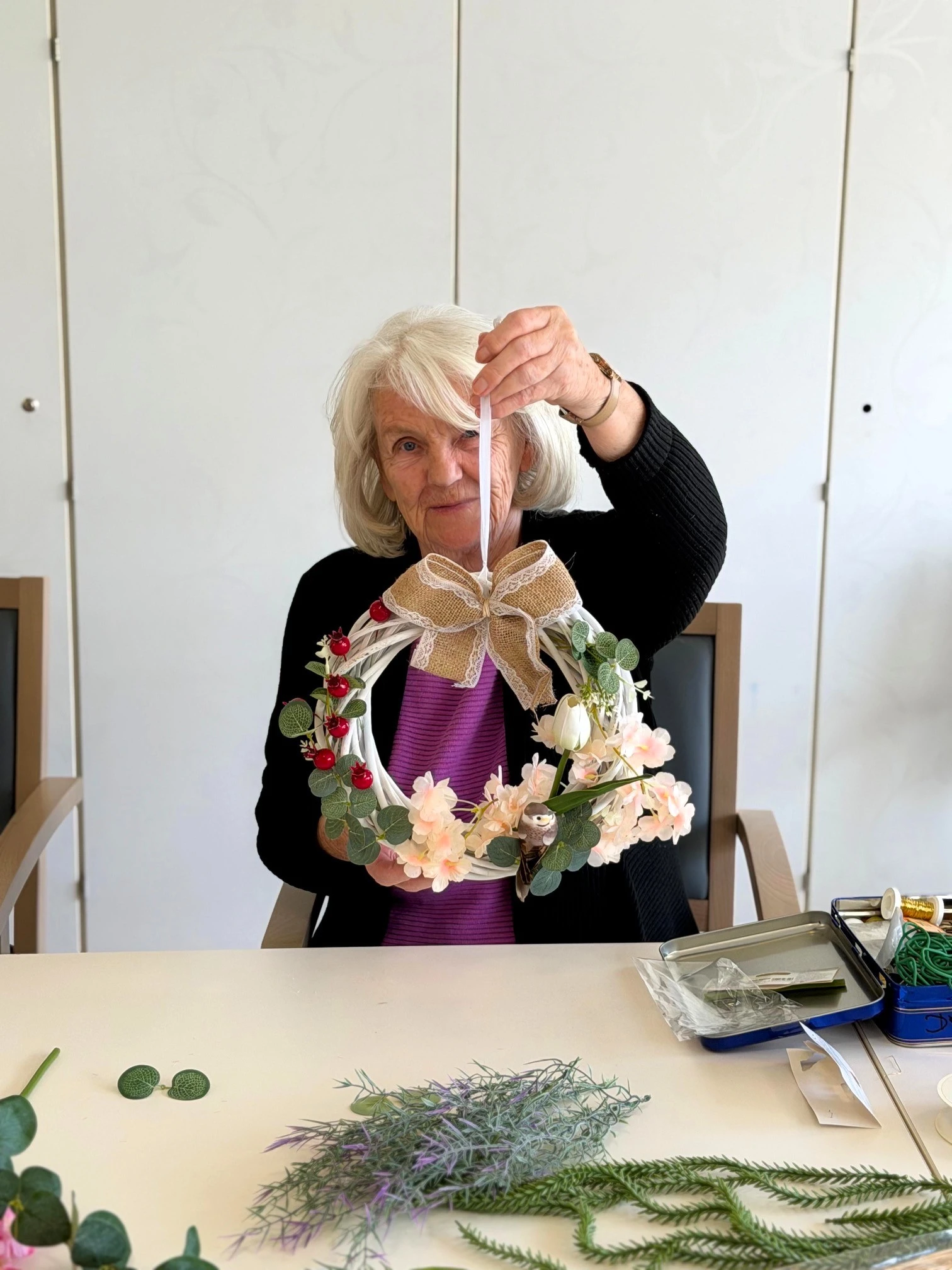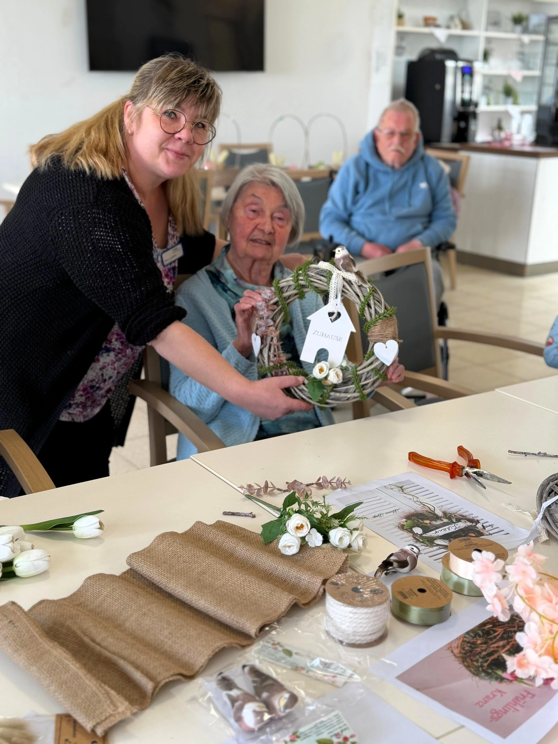 Am Ende konnten sich alle über die gelungenen Ergebnisse freuen. Die Frühlingskränze schmücken nun unsere Räume und erinnern an einen rundum gelungenen gemeinsamen Nachmittag.