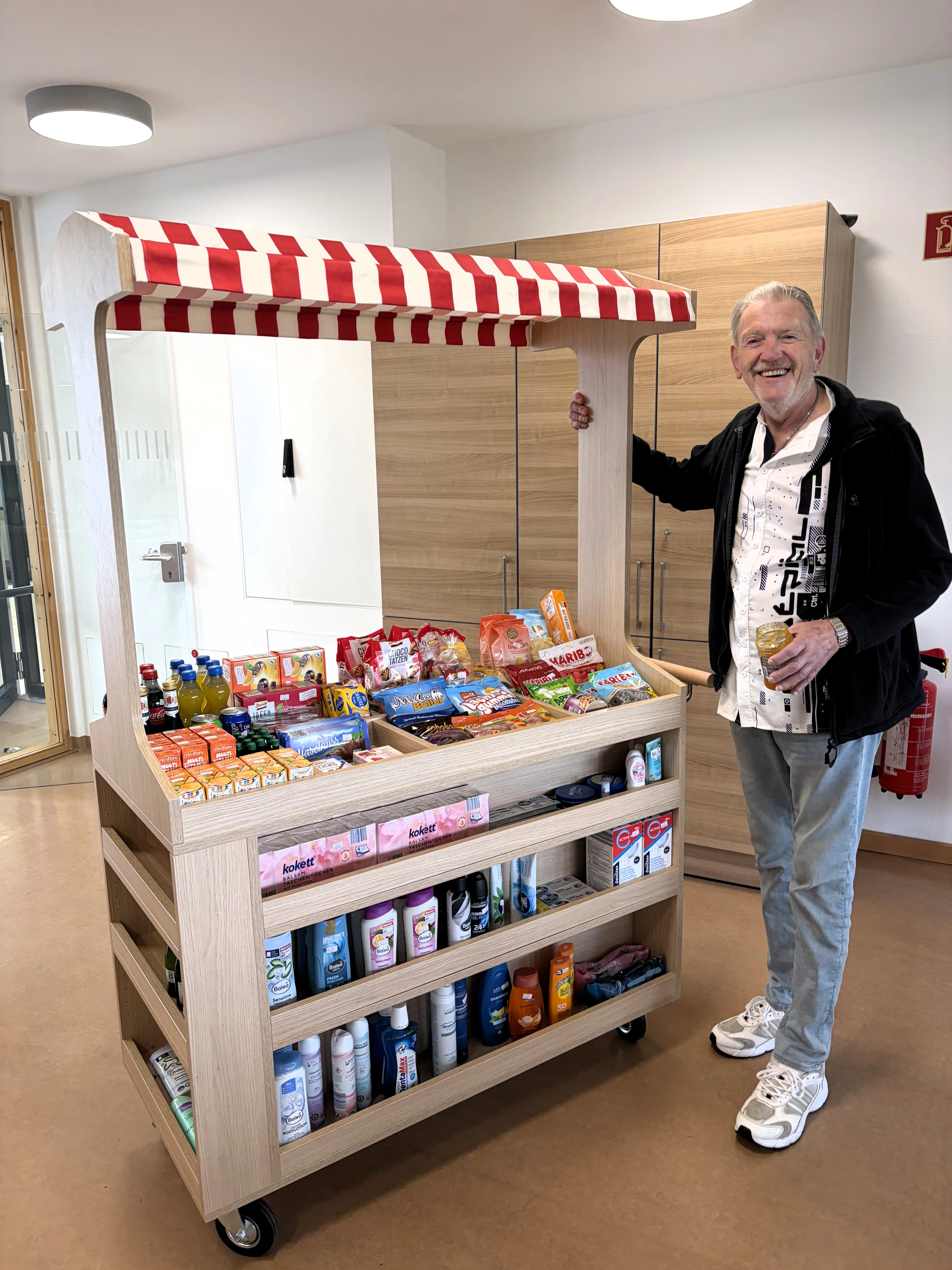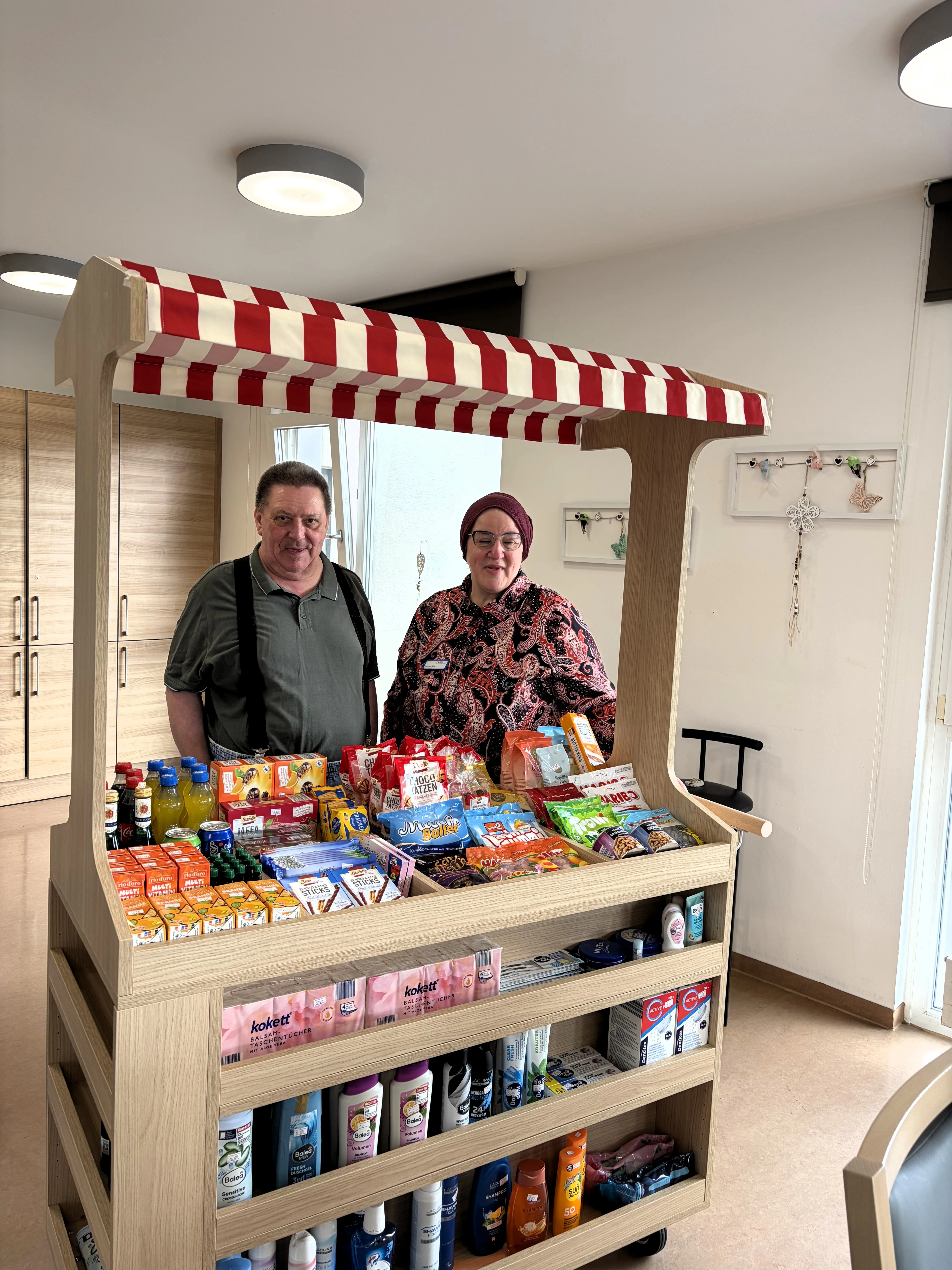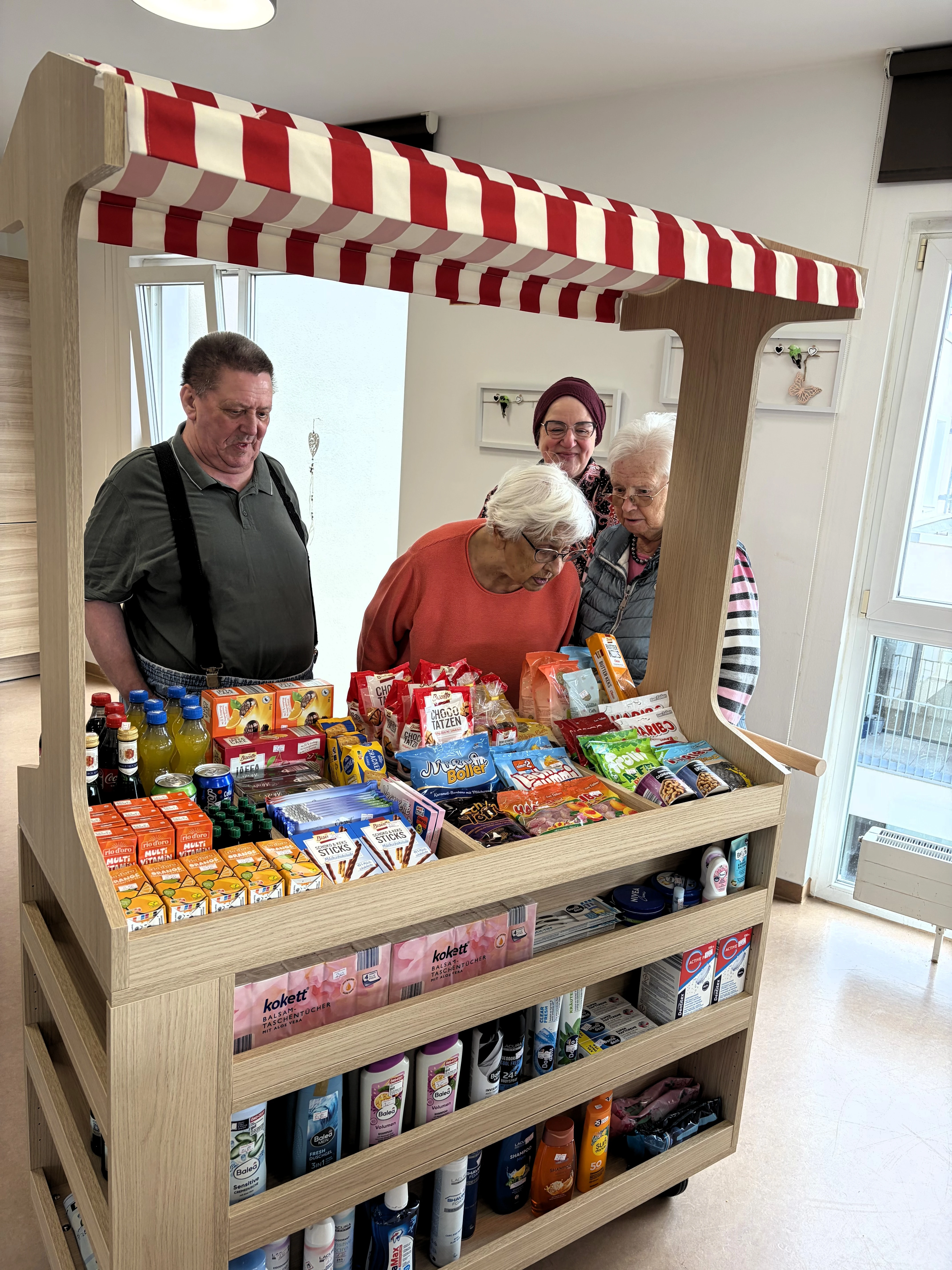 Mit dem attraktiv bestückten Kioskwagen besuchten wir unsere Bewohnerinnen und Bewohner direkt in den Wohnküchen und auf ihren Zimmern. An Bord waren erfrischende Getränke, Süßwaren und praktische Hygieneartikel. Eine bunte Auswahl, die auf große Zustimmung stieß.