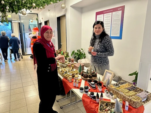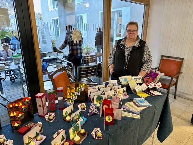 Neben den vielen Leckereien wurden auch zahlreiche Geschenk- und Dekorationsartikel angeboten: handgemachte Weihnachtsdeko, Schmuck, Karten, Taschen und Etuis, kreative Marmeladenvarianten und sogar ein Gravurstand, der personalisierte Einzelstücke fertigte. Besonders Bewohnerinnen und Bewohner, Angehörige sowie Gäste aus der Nachbarschaft nutzten die Gelegenheit, zu stöbern, zu schnuppern und kleine Schätze mit nach Hause zu nehmen. Ganz klar: Der Weihnachtsmarkt ist jedes Jahr ein besonderes Highlight. Er schafft Raum für Begegnungen und kleine Auszeiten – und ist ein schöner Anlass, gemeinsam in die Adventszeit zu starten.