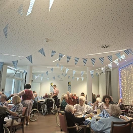Mai 2024 - "…Tulpen aus Amsterdam..." Das war nur einer der Schlager aus den 50er und 60er Jahren, die uns das „Duo Fröhlich“, bestehend aus Guido Pickers und Dr. Friedhelm Endemann bei unserem Frühlingsfest schwungvoll präsentierte. Unsere Cafeteria war wunderschön mit den selbstgebastelten Frühlingsblumen unserer Bewohner geschmückt; zusätzliche Farbtupfer brachten die Tulpen, die auf jedem Tisch standen. In dieser frischen und fröhlich gestalteten Umgebung feierten wir mit über 60 Personen bei Kaffee und Kuchen sowie Frühlingsbowle und anderen Leckereien den Frühling. Es wurde viel mitgesungen und fleißig getanzt, selbst die Mitarbeitenden wurden zu einem Tanz motiviert. Alles in allem eine tolle Feier mit richtig guter Stimmung.