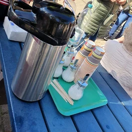Dez 2023 - Weihnachten steht vor der Tür - und ist bei uns bereits eingezogen: Bei unserem Mini-Weihnachtsmarkt zog der Duft von frisch gebackenen Reibeplätzchen, Waffeln, Kaffee und Glühwein durch das Haus. Unsere ehrenamtliche Mitarbeiterinnen verkauften an einem Stand hübsches Allerlei, bei stimmungsvoller Weihnachtsmusik genossen alle das gemütliche Beisammensein.