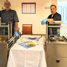 Unser Kompetenzteam Küche, Herr Große und Herr Garrido, verwöhnten die Bewohnerinnen und Bewohner des Hauses an diesem Tag mit einer leckeren Schweinshaxe, Sauerkraut und Kartoffelstampf oder – wer es lieber fleischlos mochte – mit Käsespätzle, Röstzwiebeln und saftigem Gurkensalat. Als Nachtisch durften sich alle eine großartige bayrische Creme mit Erdbeersoße schmecken lassen. Dazu das obligatorische Weißbier und zur Verdauung dann noch einen feinen Obstler – so lässt es sich aushalten! Das fanden auch die Bewohnerinnen und Bewohner des Glockengartens und lobten das Essen in den höchsten Tönen.
