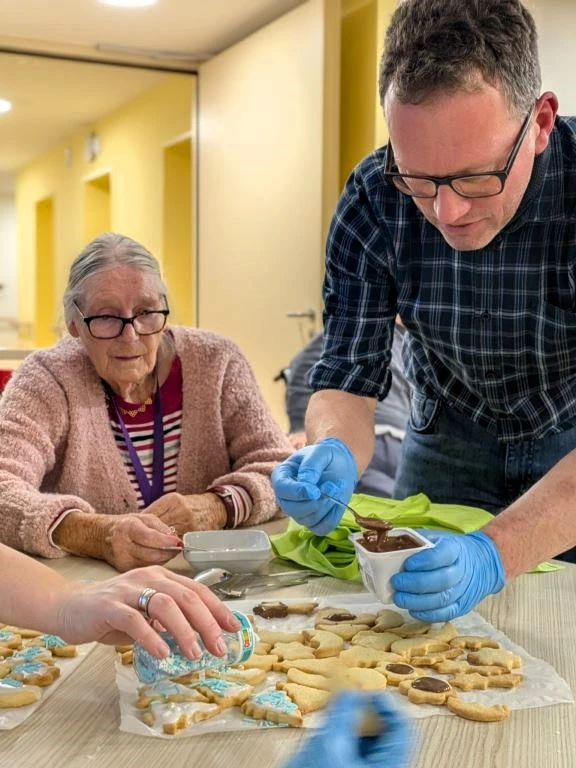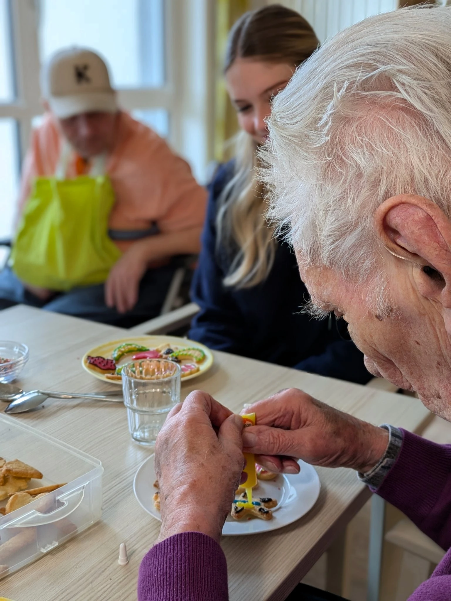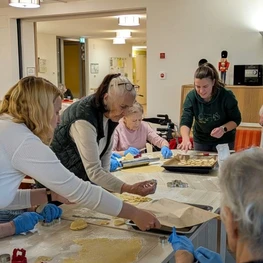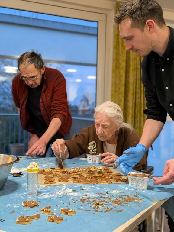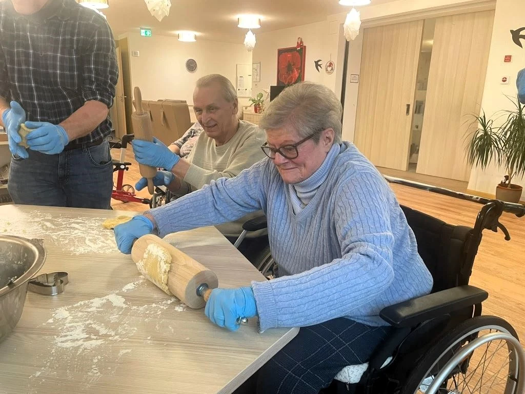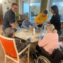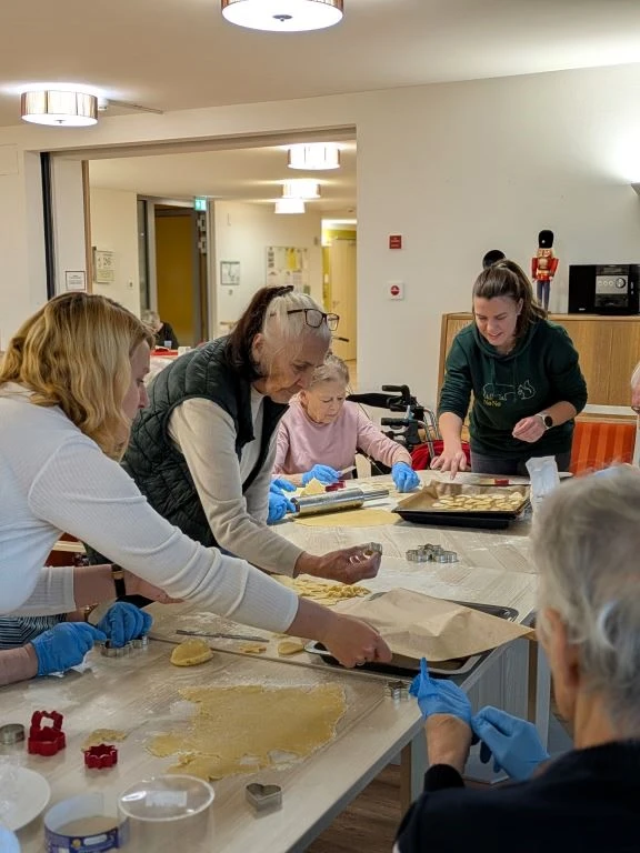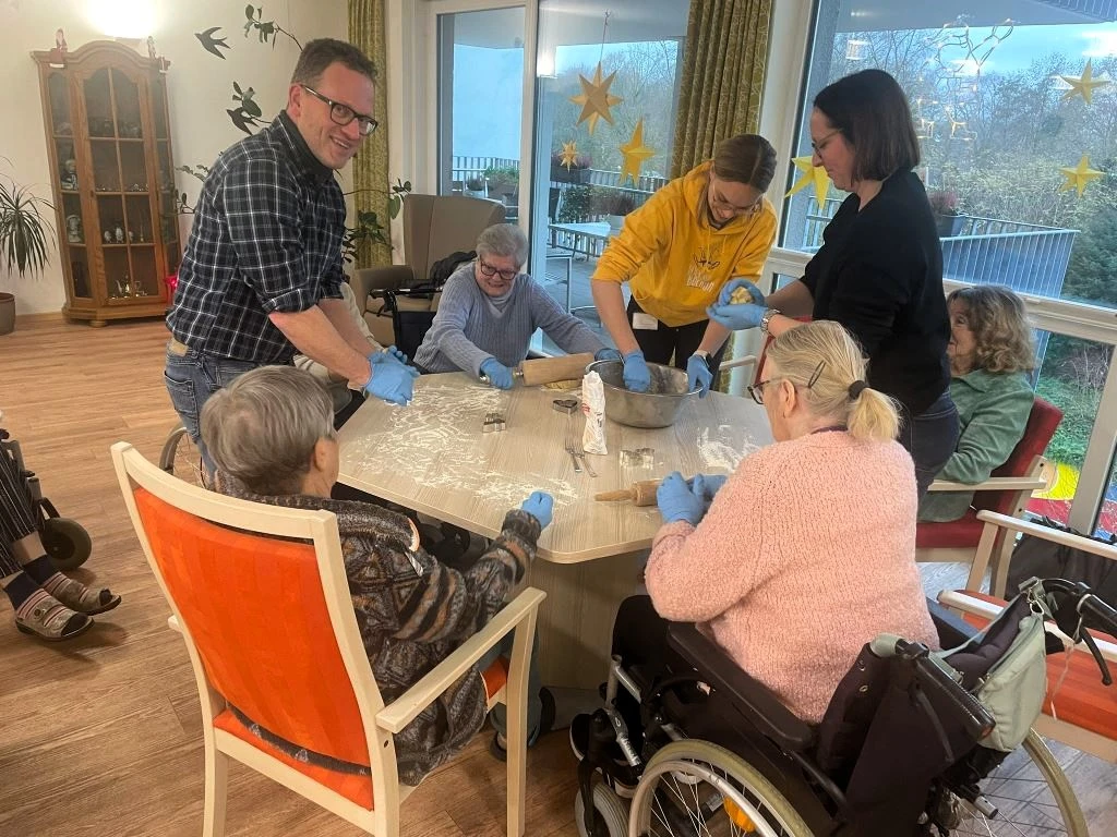 Nachmittags kam die zweite Gruppe der Stadtwerke-Mitarbeitenden, um mit unseren Bewohnern Weihnachtsplätzchen zu backen. Der Duft von frischen Keksen zog durch alle vier Etagen. Die Gespräche drehten sich wieder um alte Zeiten, als das Backen von Plätzchen noch eine wichtige Tradition in vielen Haushalten war. Der Nachmittag klang dann für die „Stadtwerkler“ gemütlich bei Kaffee und Kuchen aus.