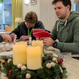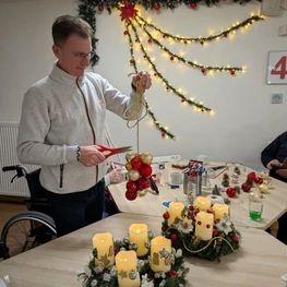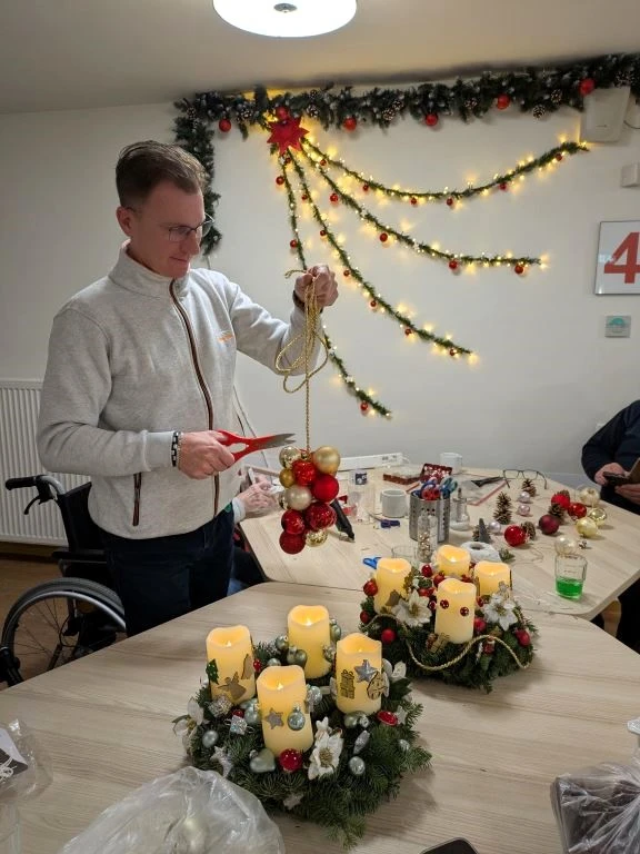 Die erste Gruppe machte sich am Vormittag daran, mit unseren Bewohnern Adventskränze zu basteln. Der Tisch war schnell gedeckt mit grünen Kränzen, bunten Bändern und allerlei Dekorationen. Es dauerte nicht lange, bis der Raum von fröhlichem Geplauder erfüllt war. Am Ende des Vormittags konnten sich die Mitarbeitenden der Stadtwerke mit ein paar Stücken Pizza stärken.