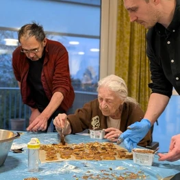 Die verlockenden Düfte blieben nicht unbemerkt: Immer mehr Bewohner kamen neugierig vorbei, naschten am Teig oder genossen den würzigen Bratenduft. Manche ließen sich zum Mithelfen animieren, andere freuten sich einfach über das gesellige Treiben.