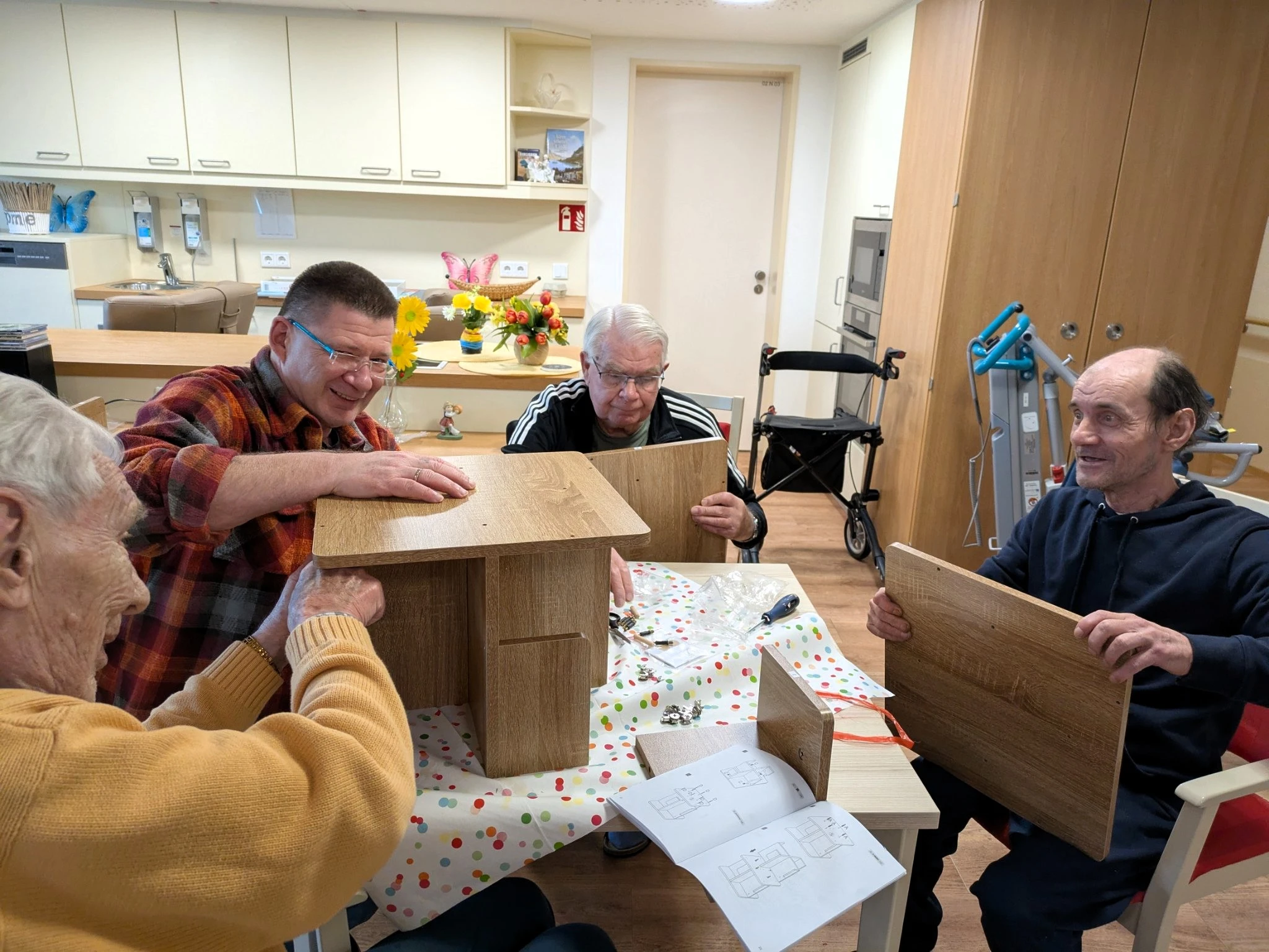 Da unsere Hausmeister leider schon genug um die Ohren hatten, war schnell klar: Warum nicht unsere handwerklich geschickten Bewohner um Hilfe bitten? Gesagt, getan. Ein kurzer Aufruf im Haus – und schon hatten wir eine Handvoll Freiwillige, die mit etwas Geduld und Geschick das Regal zusammenbauen wollten.