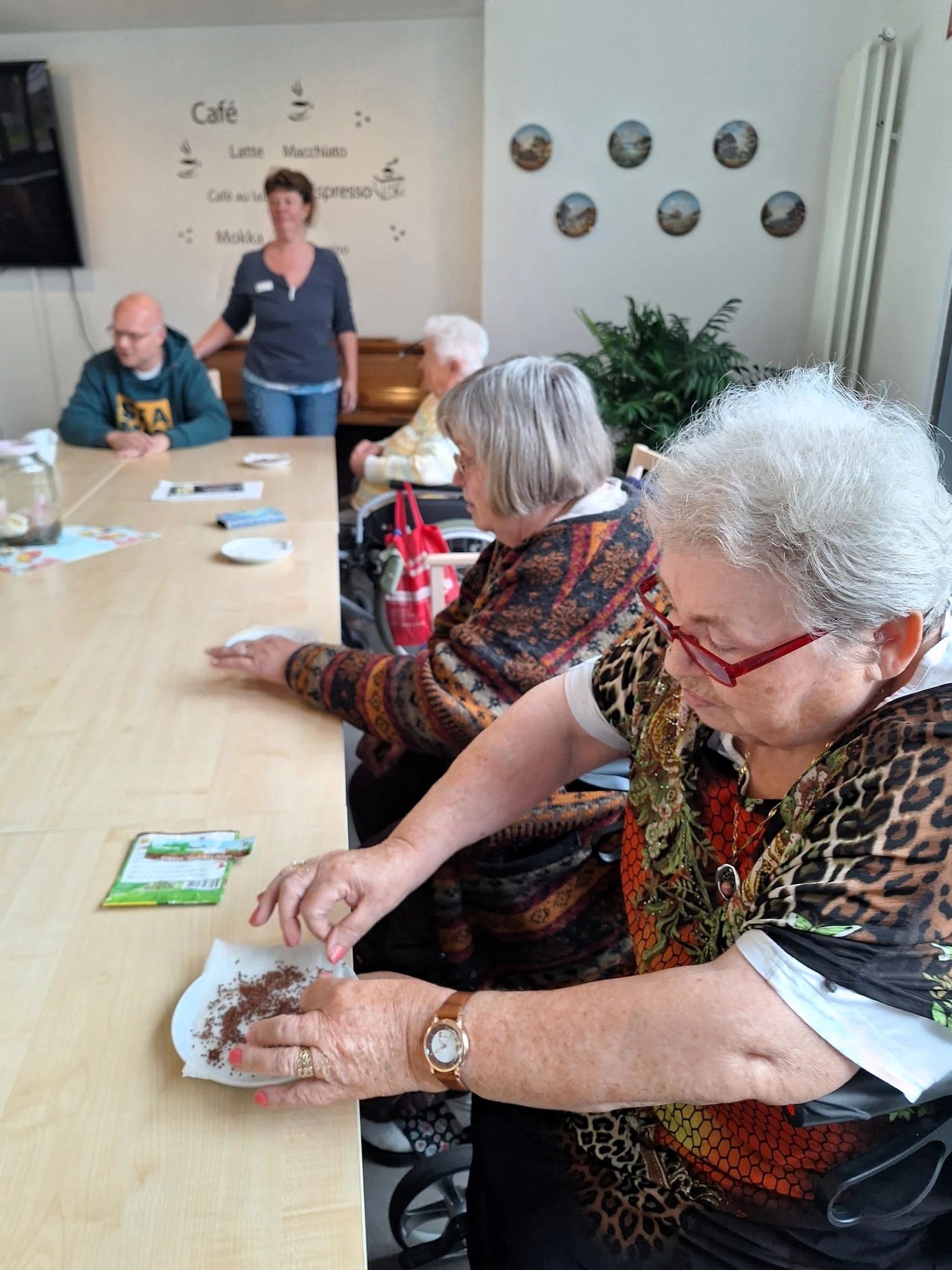Aug 2025 - Unsere Gartentherapiegruppe war wieder einmal sehr kreativ und mit vollem Eifer dabei: Alle haben mit angepackt und geholfen, als wir Pesto mit Kräutern wie Basilikum sowie Rucola und Tomaten aus eigenem Anbau herstellten. Erst wurde geschnibbelt, dann geschmaust – und alle waren begeistert von Tomate-Mozzarella mit unserem Basilikum-Pesto. Ganz nebenbei spielten wir noch ein tolles Gedächtnistraining mit Fragen zu Kräutern.
