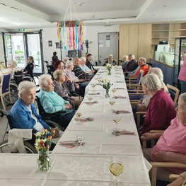 Mai 2024 - In angenehmer Gesellschaft schmeckt es gleich doppelt gut: Zu einem gemeinsamen Frühstück waren alle Bewohnerinnen und Bewohner in die Cafeteria. Bei einem Gläßchen Sekt, leckeren Brötchen, einer Vielfalt an Aufschnitt sowie Rührei und Tomaten ließen es sich alle schmecken.