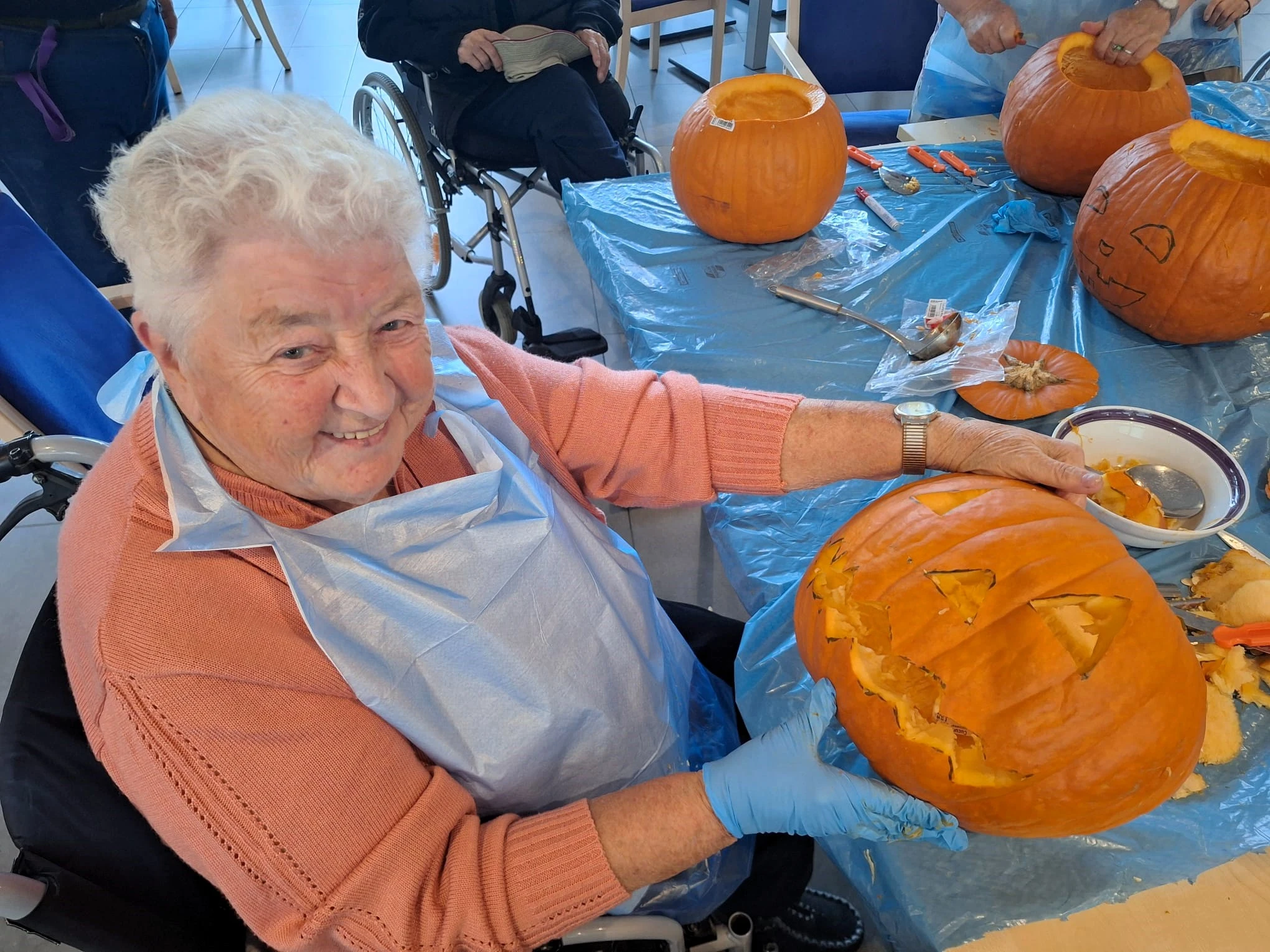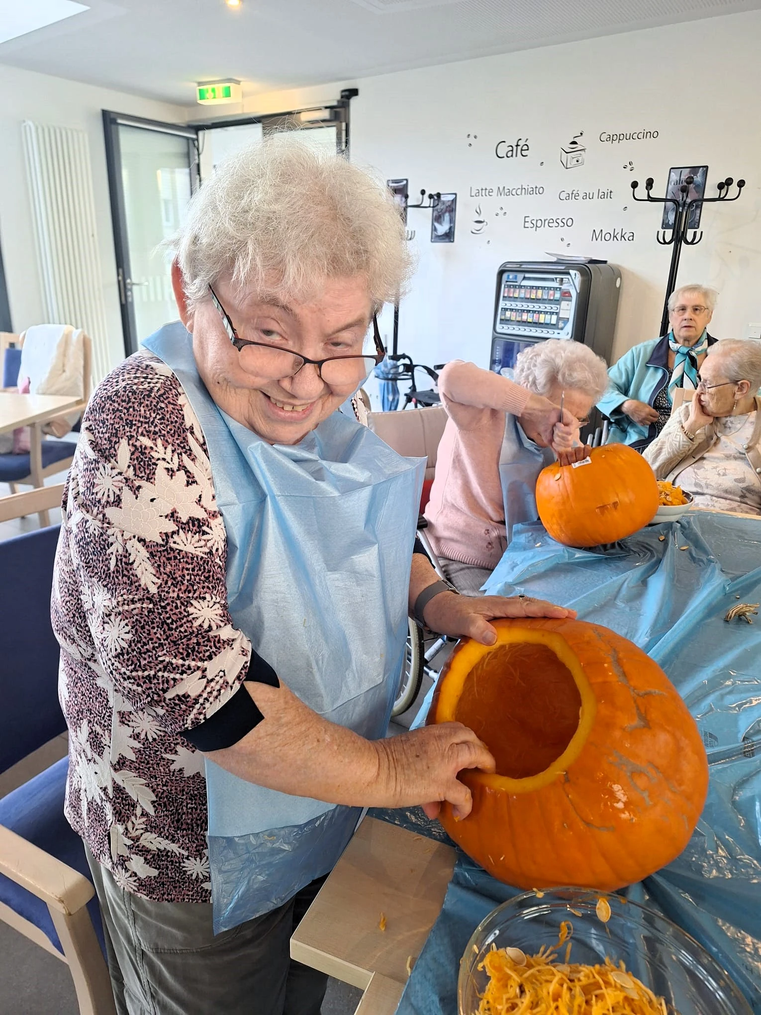 Zum Abschluss erhielten die Kürbisse jeweils eine Kerze und wurden auf den Terrassen der Wohnbereiche aufgestellt. Nun leuchten sie in den Abendstunden und verbreiten ein warmes, gemütliches Licht, das Bewohnerinnen, Bewohner und Gäste gleichermaßen erfreut.