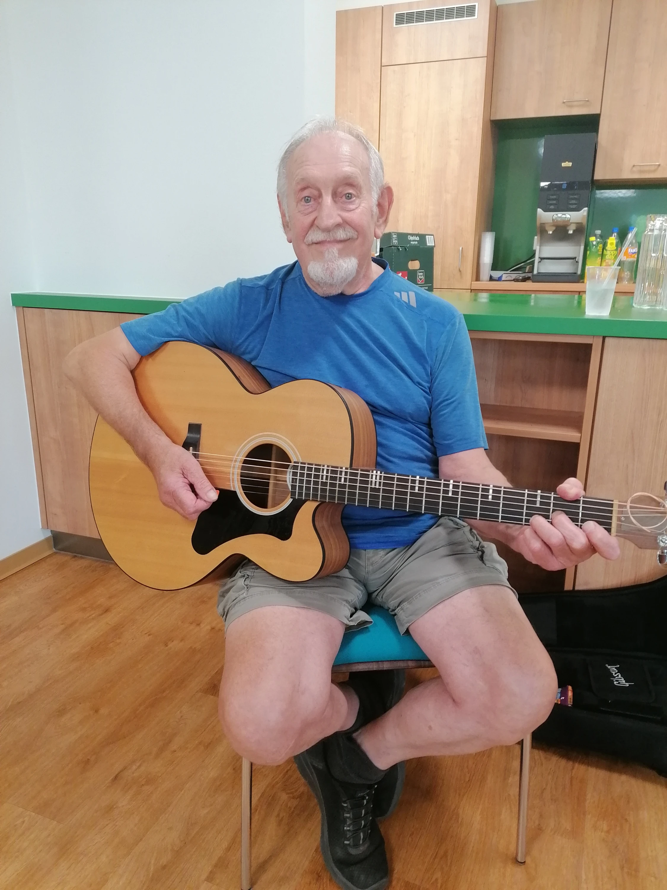 So war es auch kürzlich , als uns ein ganz besonderer Gast besuchte: George Kaye, geboren in Irland, der Liebe wegen nach Deutschland gezogen – und heute unser Nachbar. Früher war er ein bekannter Sänger und Gitarrist mit eigener Band und Platzierungen in den irischen Charts. Eines Tages stand er einfach bei uns vor der Tür und fragte, ob er unseren Bewohnerinnen und Bewohnern eine Freude machen dürfe. Einfach so, weil er gerne etwas zurückgeben wollte von all den schönen Erlebnissen, die er selbst in seinem Leben erfahren hat. Diese Herzlichkeit hat uns sofort berührt – und so entstand ganz spontan die Idee zu einem „Irischen Nachmittag“.