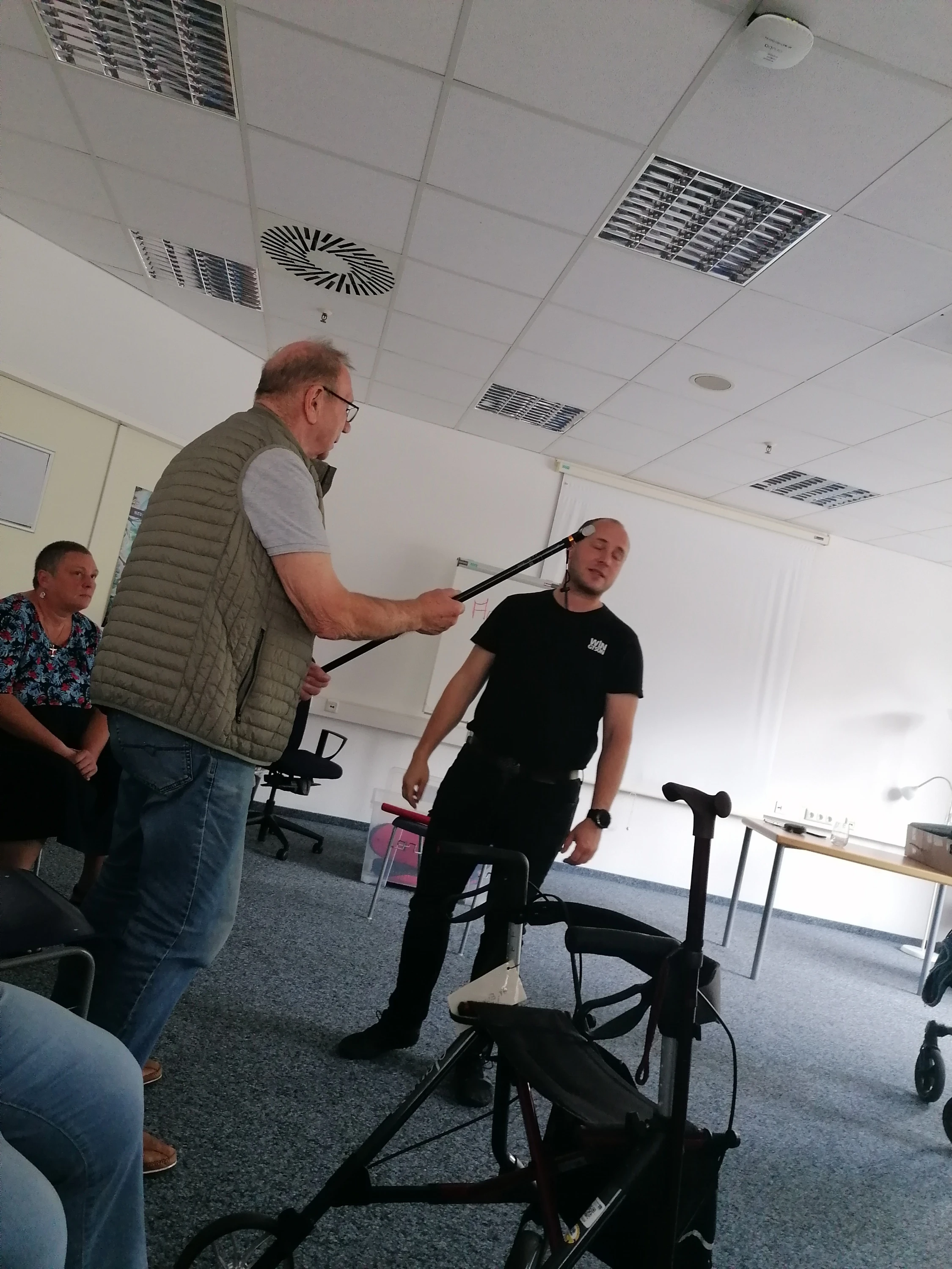 Die Veranstaltung war von Frau Haupts und ihrem Team hervorragend organisiert und bot viele spannende Einblicke. Gemeinsam haben wir erfahren, dass Selbstsicherheit nicht nur eine Frage der körperlichen Stärke ist, sondern vor allem im Auftreten liegt. In anschaulichen Übungen wurde gezeigt, wie man mit einfachen Mitteln – und sogar mit dem eigenen Rollator – reagieren kann, wenn einem jemand zu nahe kommt oder man sich unwohl fühlt.