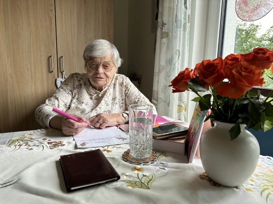 Am Tisch in ihrem hellen Zimmer sitzt sie, den pinkfarbenen Füller in der Hand. Neben ihr ein großes Glas Wasser, davor ein Strauß Rosen, frisch und farbenfroh in der Vase. Der Sessel stammt aus ihrem früheren Zuhause, ebenso einige der Möbel, die ihr nun Vertrautheit schenken. „Ich bin froh, hier zu sein“, sagt sie leise. Mit 88 Jahren genießt sie den Alltag in unserem Haus, die Spaziergänge durch den Stadtgarten – und vor allem die Zeit, die sie zum Schreiben hat.